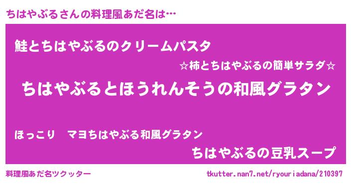 | ヘコむあだ名 | 『ちはぷりん』『ちはやぶる(苦笑)』 |