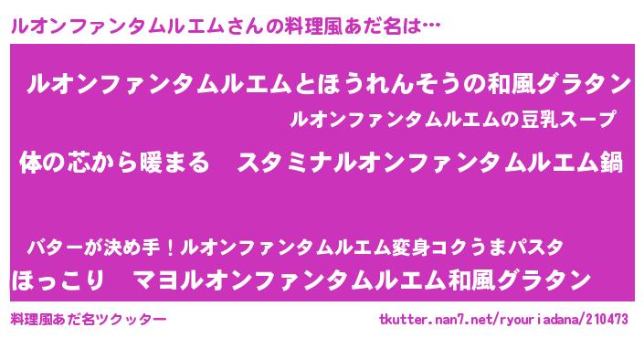 | 男性向けラノベタイトル風あだ名 | 『やはりルオンファンタムルエムの青春ラブコメはまちがっている 』 |