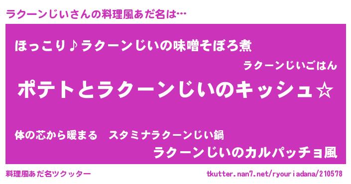 | 女子向けラノベタイトル風あだ名 | 『ラクーンじいの卵を拾いまして』 |