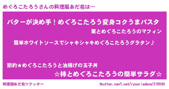 | 男性向けラノベタイトル風あだ名 | 『めぐろこたろうの嫁は女の子じゃないと思った?』 |