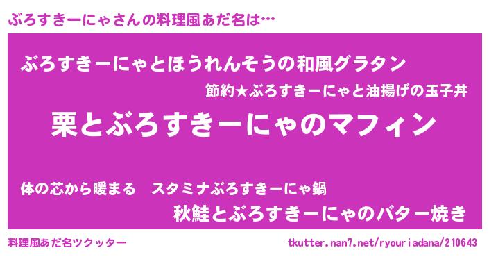 | 胡散臭い通販商品みたいなあだ名 | 『絶対に幸福をもたらす健康食品…その名も「ぶろすきーにゃ」』 |