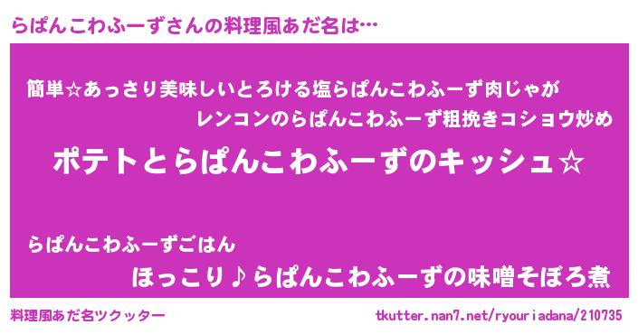 | 男性向けラノベタイトル風あだ名 | 『らぱんこわふーずの嫁は女の子じゃないと思った?』 |