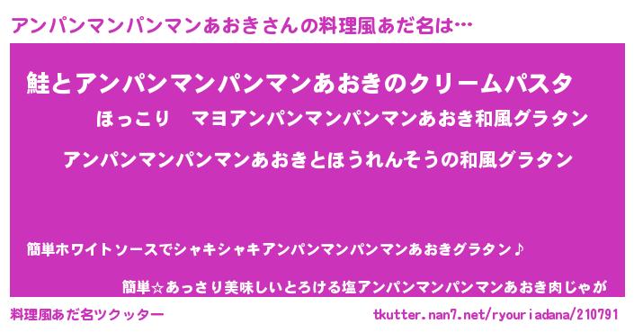 | 男性向けラノベタイトル風あだ名 | 『アンパンマンパンマンあおき~年齢イコール彼女いない歴の魔法使い~』 |