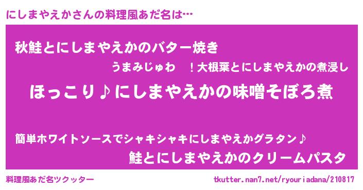 | ヘコむあだ名 | 『にしっふぃ~』『にしまやえか(笑)』 |