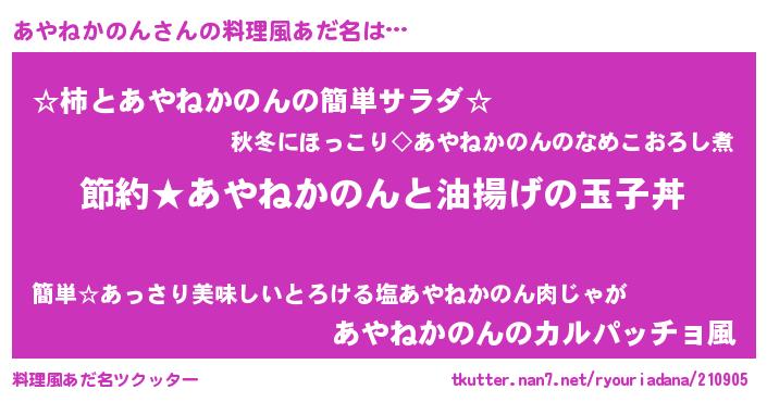 | 男性向けラノベタイトル風あだ名 | 『アヤネカノンアートオンライン』 |