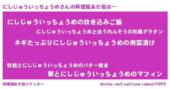 | 男性向けラノベタイトル風あだ名 | 『ニシジュウイッチョウメアートオンライン』 |