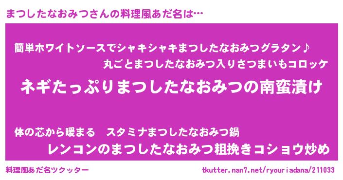 | ピコ太郎風あだ名 | 『マコ四郎』『マツ太郎』『ピマ五郎』 |