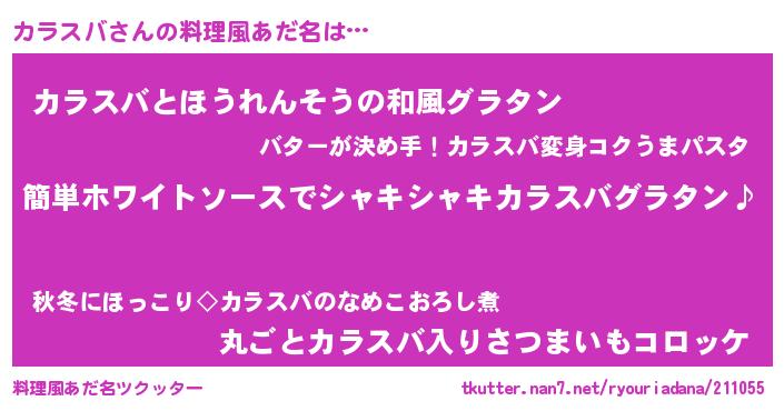 | 男性向けラノベタイトル風あだ名 | 『カラスバの嫁は女の子じゃないと思った?』 |