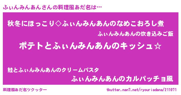 | 女子向けラノベタイトル風あだ名 | 『ふぃんみんあんの卵を拾いまして』 |
