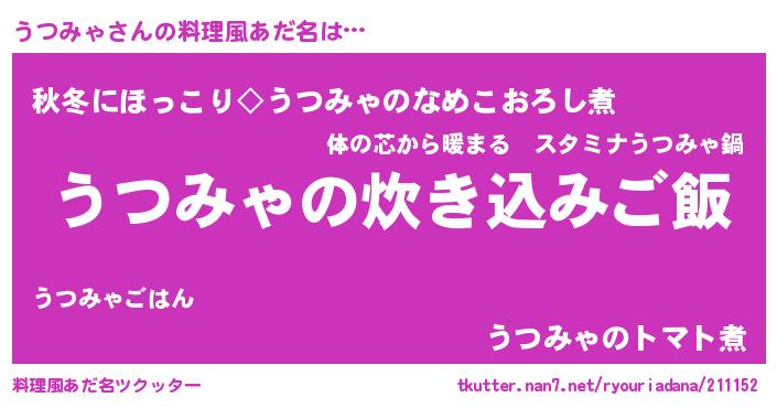 | ヘコむあだ名 | 『なまこ酢』『うつみゃ(爆)』 |