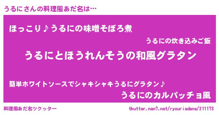 | 男性向けラノベタイトル風あだ名 | 『転生したらうるにだった件』 |