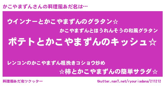 | 女子向けラノベタイトル風あだ名 | 『かこやまずんの卵を拾いまして』 |