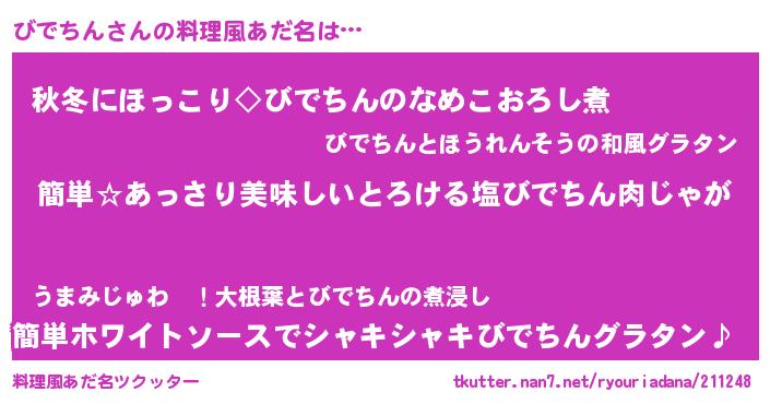 | 女子向けラノベタイトル風あだ名 | 『異世界でカフェびでちんを開店しました。』 |