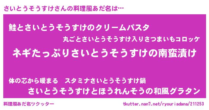 | 女子向けラノベタイトル風あだ名 | 『誰かこのさいとうそうすけを説明してください! ~契約から始まるウェディング~』 |