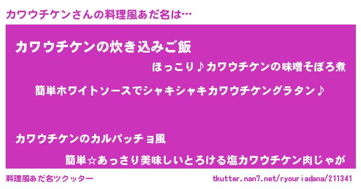 | 男性向けラノベタイトル風あだ名 | 『カワウチケンの嫁は女の子じゃないと思った?』 |