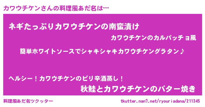 | ヒーロー風カッコイイあだ名 | 『炎刃騎士カワ』『スーパーカワウチケン』 |