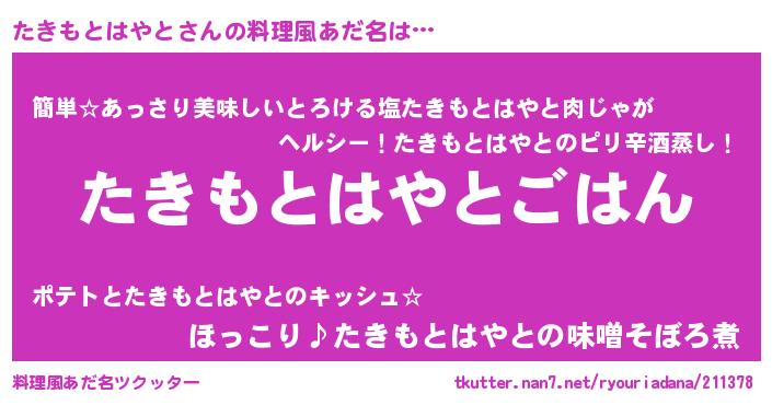 | ヘコむあだ名 | 『たきもとはやと(爆)』『たきもー』 |