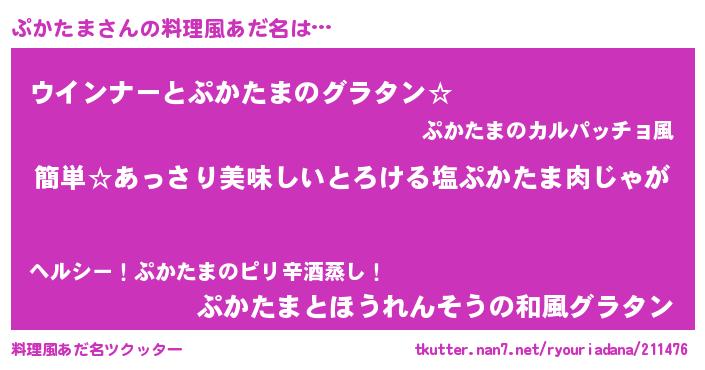 | ヒーロー風カッコイイあだ名 | 『ネオプカタマ』『ウルトラぷかたまマン』 |