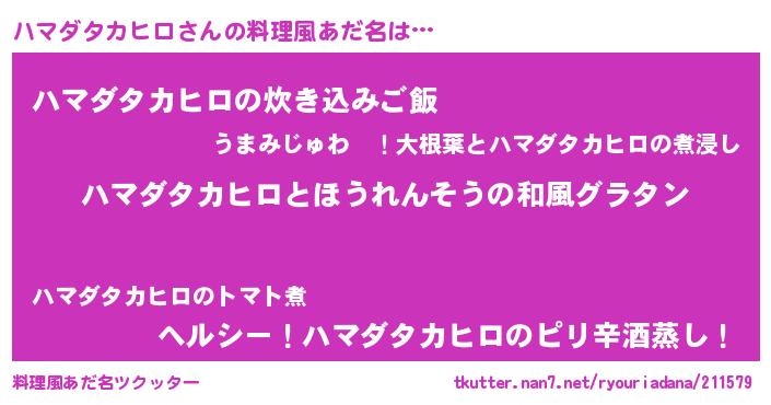 | 男性向けラノベタイトル風あだ名 | 『転生したらハマダタカヒロだった件』 |