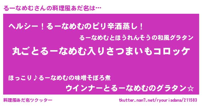 | 男性向けラノベタイトル風あだ名 | 『この素晴らしい世界にるーなめむを!』 |