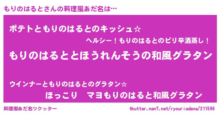 | 男性向けラノベタイトル風あだ名 | 『もりのはると~年齢イコール彼女いない歴の魔法使い~』 |