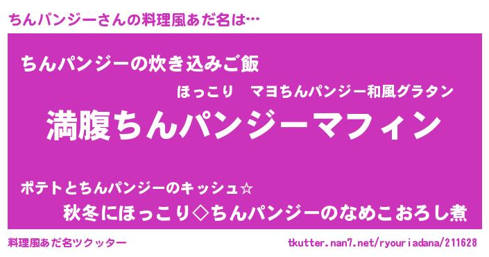 | 女子向けラノベタイトル風あだ名 | 『異世界で失敗しない100のちんパンジー』 |