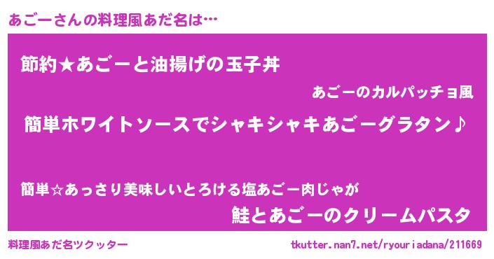 | ピコ太郎風あだ名 | 『アゴ一郎』『アコ十郎』『アア太郎』 |
