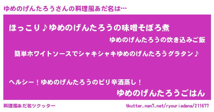| 男性向けラノベタイトル風あだ名 | 『ゆめのげんたろうの嫁は女の子じゃないと思った?』 |