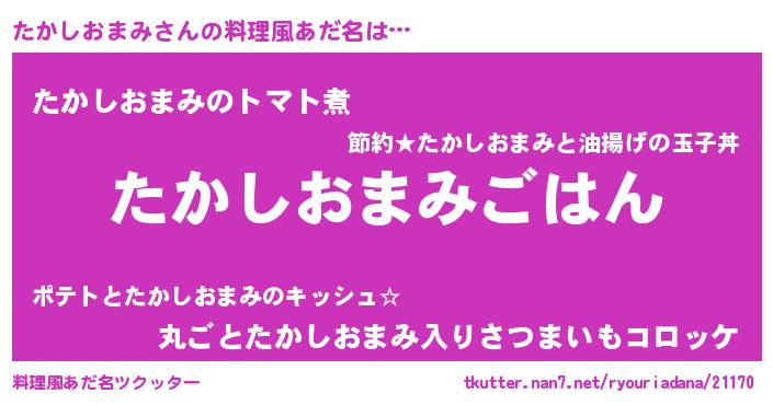 | 男性向けラノベタイトル風あだ名 | 『転生したらたかしおまみだった件』 |