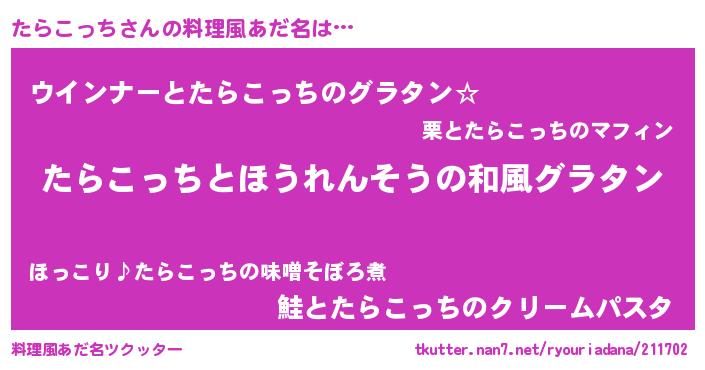 | 女子向けラノベタイトル風あだ名 | 『たらこっちの玉の輿計画!』 |