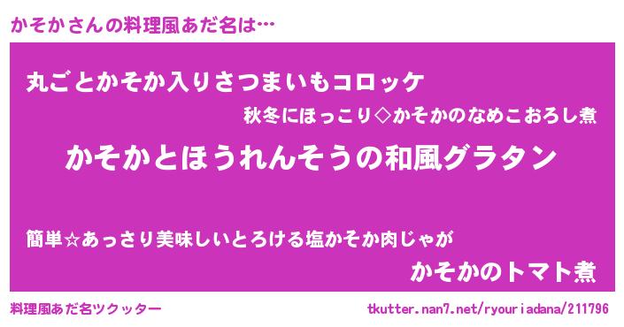 | ヘコむあだ名 | 『かそか(笑)』『なまこ酢』『かそを』 |