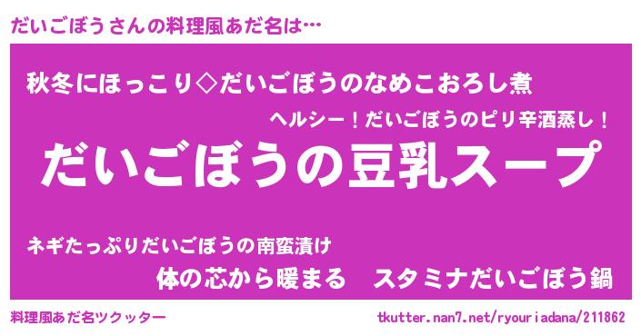 | 女子向けラノベタイトル風あだ名 | 『だいごぼうは平凡を望む』 |