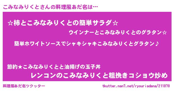| 女子向けラノベタイトル風あだ名 | 『こみなみりくと様がみてる』 |