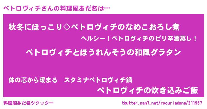 | 胡散臭い通販商品みたいなあだ名 | 『テレビで話題のアガリクス…その名も「ペトロヴィチ」』 |