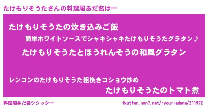| 男性向けラノベタイトル風あだ名 | 『たけもりそうた~年齢イコール彼女いない歴の魔法使い~』 |