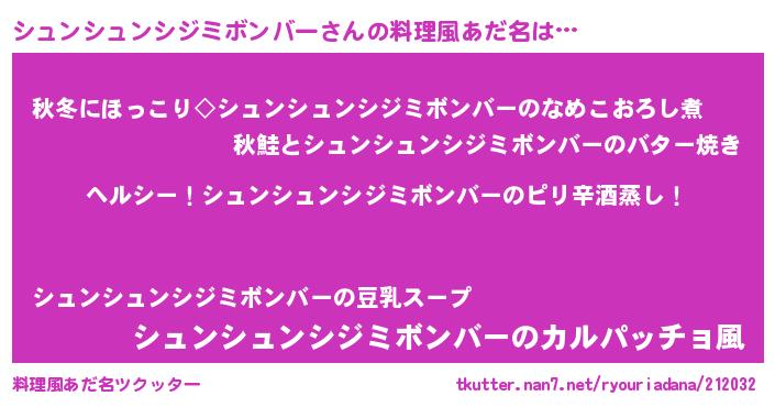 | 男性向けラノベタイトル風あだ名 | 『Re:シュンシュンシジミボンバーから始める異世界生活』 |