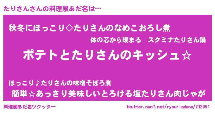 | 女子向けラノベタイトル風あだ名 | 『たりさんの卵を拾いまして』 |