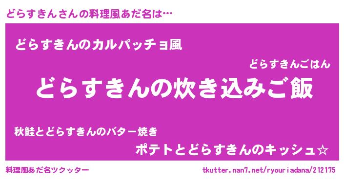 | 意味不明あだ名 | 『住所不定無職どらすきん(85歳)』 |