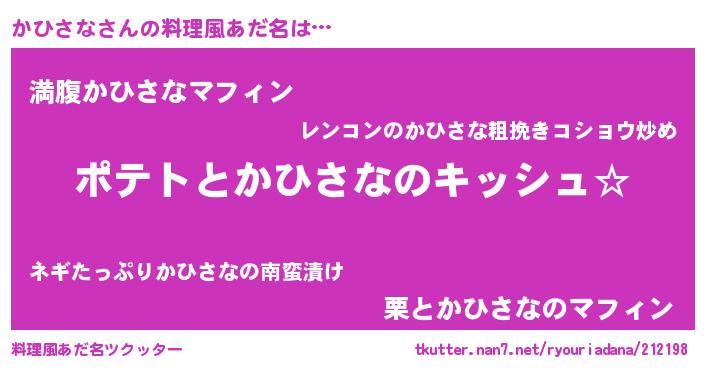 | 女子向けラノベタイトル風あだ名 | 『かひさなの卵を拾いまして』 |