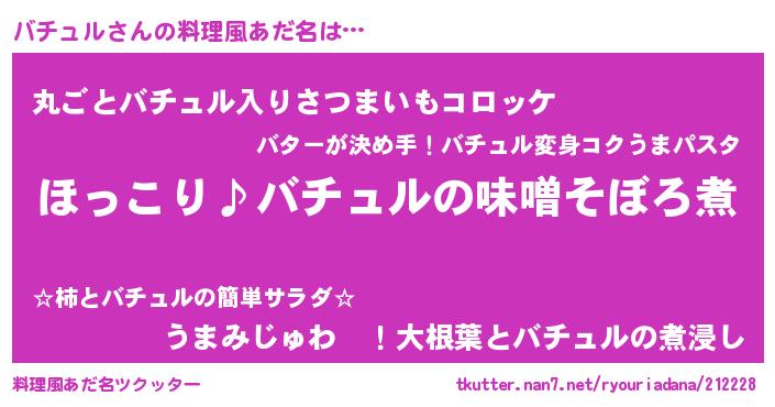 | 女子向けラノベタイトル風あだ名 | 『(仮)バチュルのやんごとなき事情』 |