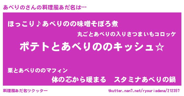 | 女子向けラノベタイトル風あだ名 | 『あべりのの卵を拾いまして』 |