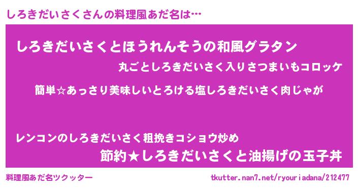 | 胡散臭い通販商品みたいなあだ名 | 『前代未聞の健康食品…その名も「しろきだいさく」』 |
