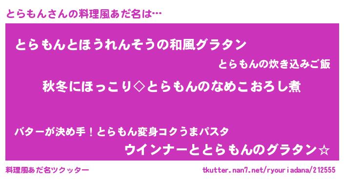 | 男性向けラノベタイトル風あだ名 | 『とらもんに滅ぼされるだけの簡単なお仕事です』 |