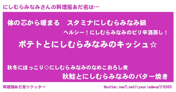 | ポケモン風あだ名 | 『ヒニシムラミナミ』『ニシムダネ』 |
