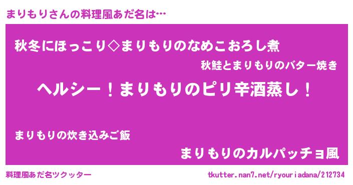 | 男性向けラノベタイトル風あだ名 | 『Re:まりもりから始める異世界生活』 |