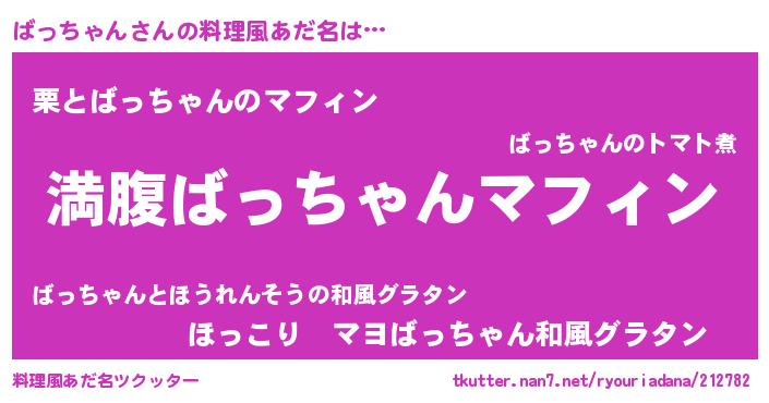 | 女子向けラノベタイトル風あだ名 | 『異世界で失敗しない100のばっちゃん』 |