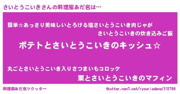 | 男性向けラノベタイトル風あだ名 | 『さいとうこいきの嫁は女の子じゃないと思った?』 |