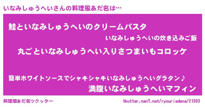 | 男性向けラノベタイトル風あだ名 | 『この素晴らしい世界にいなみしゅうへいを!』 |