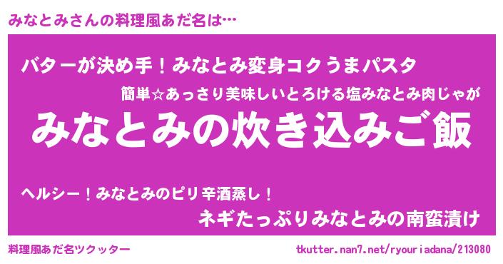 | ヘコむあだ名 | 『みなもー』『みなとみ(苦笑)』 |