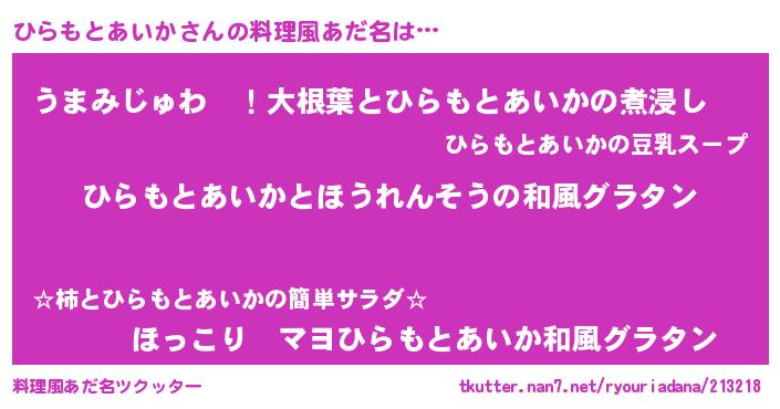 | 男性向けラノベタイトル風あだ名 | 『ひらもとあいか~年齢イコール彼女いない歴の魔法使い~』 |